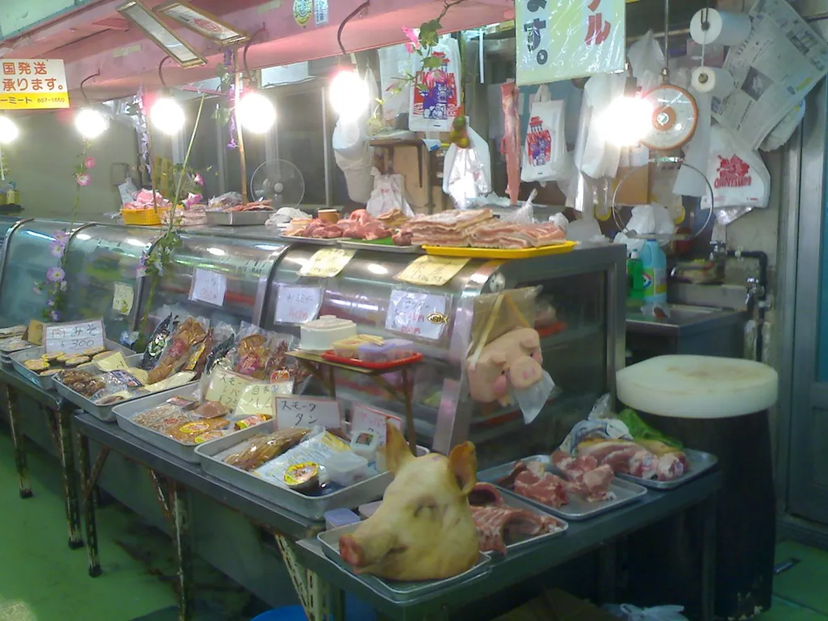 The first floor of the market is where all the lively action starts. You will see rows of vendors selling fresh tropical fish and local seafood. These fish come in bright blues, reds, and greens that look very exotic. Many sellers will offer you a small taste of seaweed or dried fish.You can also find the famous Agu pork at the many butcher stalls here. This pork is known for its high quality and rich flavor across Japan. Vendors sell everything from pork ears to snout for traditional Okinawan cooking styles. Seeing these unique cuts of meat is an interesting part of the tour.